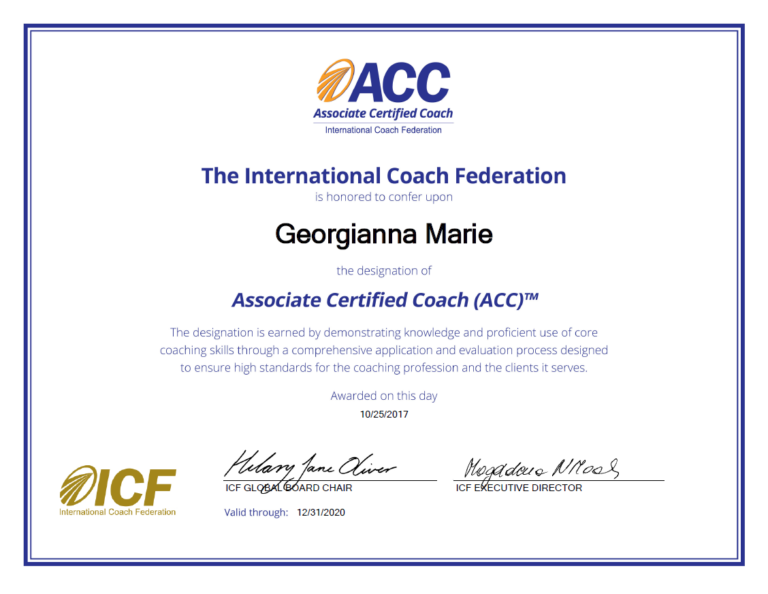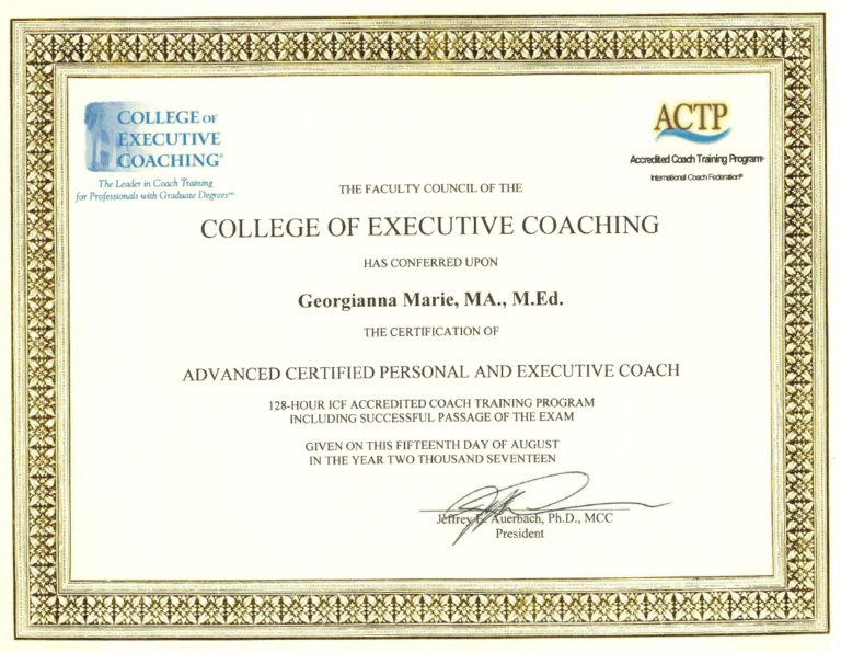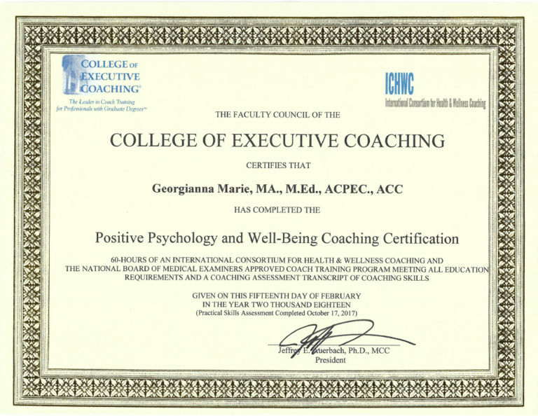 G has an M.A. in Psychology and an M.Ed. in Adult Learning. She is also an Advanced Certified Personal & Executive Coach (ACPEC), a Positive Psychology and Well-Being Certified Coach through the College of Executive Coaching, an International Coach Federation (ICF) Associate Certified Coach (ACC) and a Certified Health & Wellness (NBC-HWC) coach.