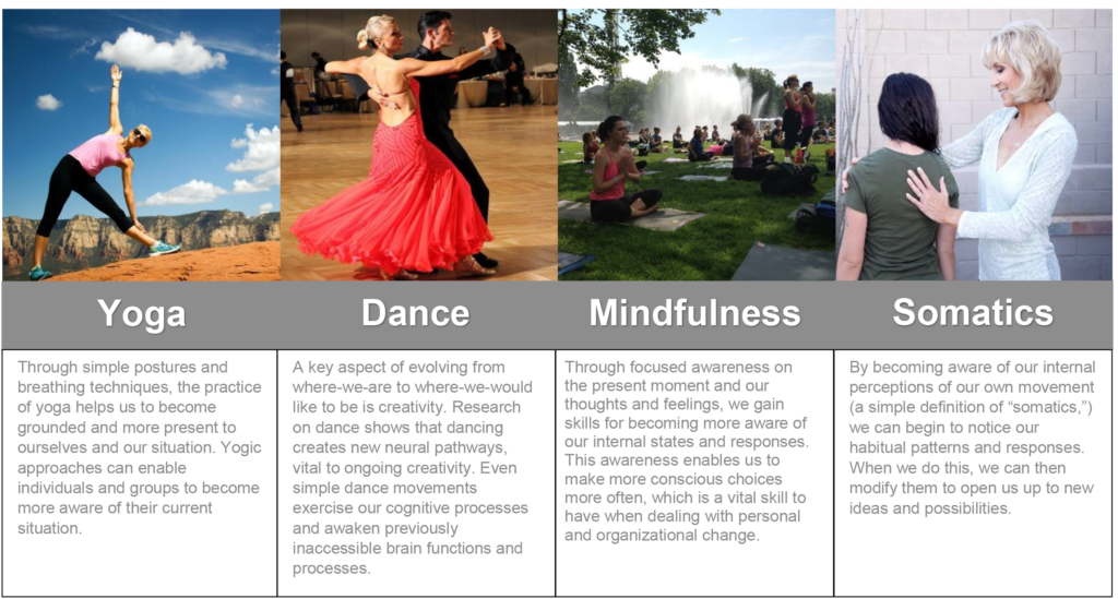Physical movement and mind/body awareness have been used in these situations in G’s work with groups, organizations and teams: